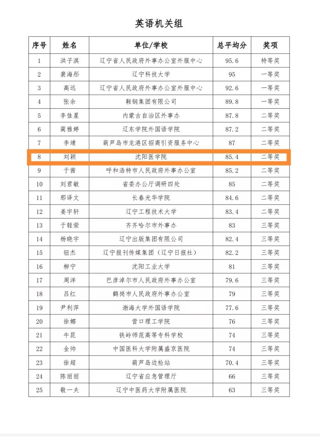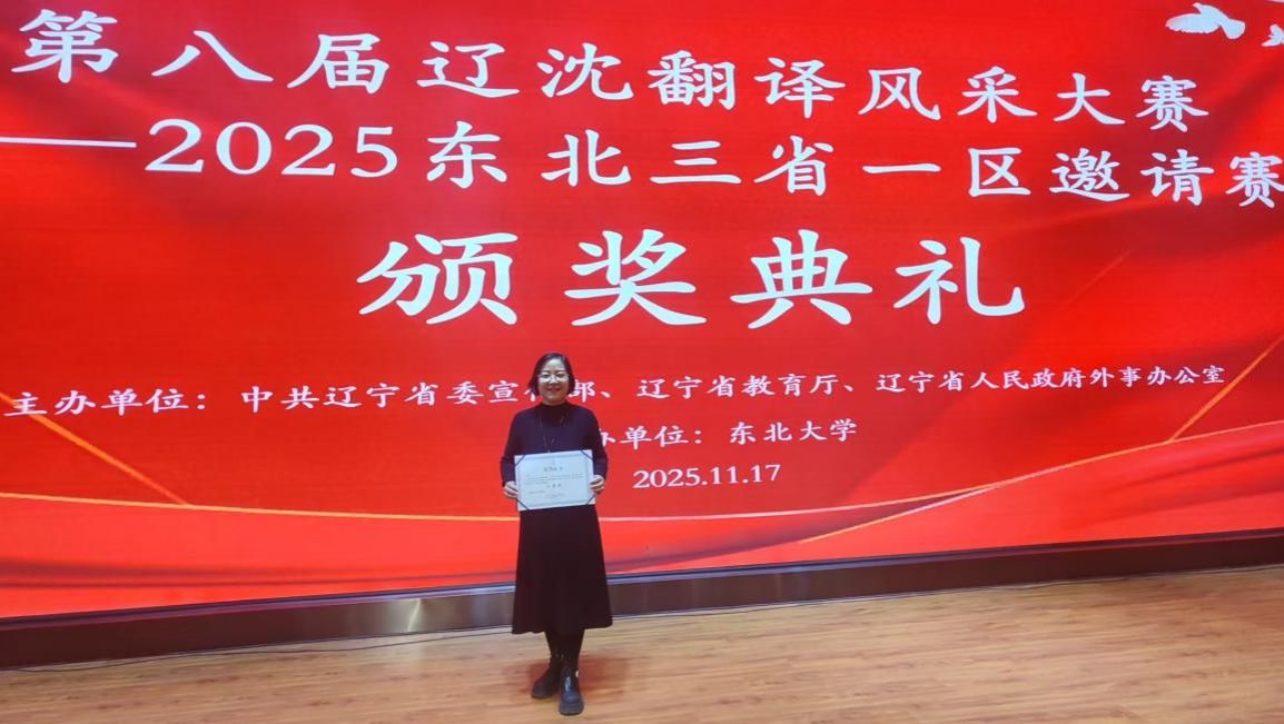 近日,由中共辽宁省委宣传部、辽宁省人民政府外事办公室、辽宁省教育厅联合举办的第八届辽沈翻译风采大赛——2025东北三省一区邀请赛在东北大学圆满落幕。本次大赛吸引了来自辽宁、吉林、黑龙江、内蒙古四地党政机关、高校及企事业单位的翻译精英同台竞技,各组别、各语种参赛总人数达479人,经过激烈角逐,最终143名选手成功晋级决赛。公司beats365官网入口刘颖老师凭借扎实的专业功底、深厚的知识储备和出色的临场发挥,在强手如林的竞争中脱颖而出。她在主题演讲、视频摘要和交替传译三个环节中,充分展现了其扎实的语言基本功、敏捷的思维应变能力、深厚的跨文化交际素养和过硬的专业实力,最终以总排名第8名的优异成绩,荣获机关英语组二等奖!其排名在沈阳地区所有高校参赛教师中高居榜首,获得了大赛评委的高度认可。